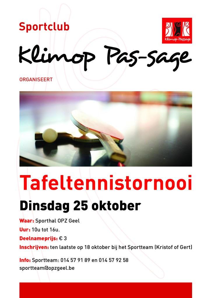Avondsport Klimop Pas-sage 6 september 2021 / tvooruitzichtgeel / Een reactie plaatsen De avondsporten van Klimop Pas-sage starten terug op. Elke maandagavond kan je bij ons terecht voor badminton en op donderdagavond voor tafeltennis.Meer info vind je HIER en HIER. Om in te schrijven neem je contact op met het sportteam@opzgeel.be