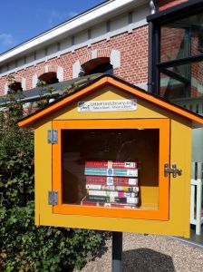 Op het terras naast onze inkom vind je een zwerfbib van de Bib van Geel. Dat is een klein kastje waar je een boek kan uitnemen en/of er een kan achter laten voor iemand anders.
